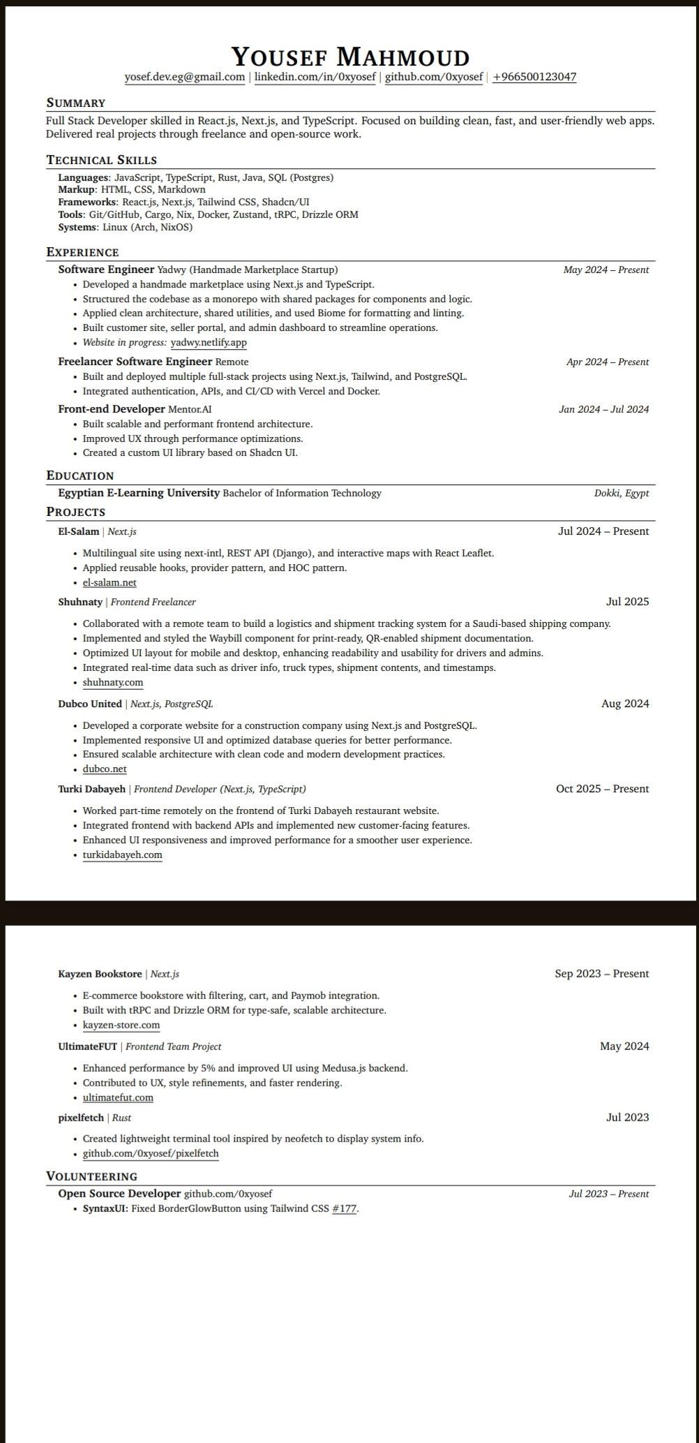 ابحث عن عمل أنا مهندس برمجيات ذو خبرة في تطوير تطبيقات الويب باستخدام تقنيات متقدمة مثل Next. js, React. js, TypeScript, PostgreSQL, Drizzle ORM, وbetter - auth. لدي خبرة قوية في تطوير الواجهات الأمامية (Frontend) والبنية التحتية للخلفية (Backend) باستخدام أدوات مثل tRPC وHono. js. أتميز بالقدرة على بناء حلول برمجية فعالة وقابلة للتطوير، مع التركيز على الأداء العالي والجودة