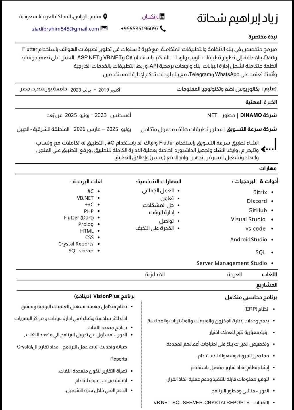 مبرمج خبرة 3 سنوات مطور أفكار متواجد في الرياض، ذو خبرة في السوق السعودي، القدرة علي تطوير وتطبيق الأفكار وتنفيذها علي أرض الواقع تنفيذ المشاريع بشكل كامل، خبرة سابقه في اطلاق التطبيقات علي متجر جوجل بلاي، والتعامل مع بوابات الدفع السعودية التقنيات Flutter, C VB. net, SQL Server, PHP, html, CSS, prolog