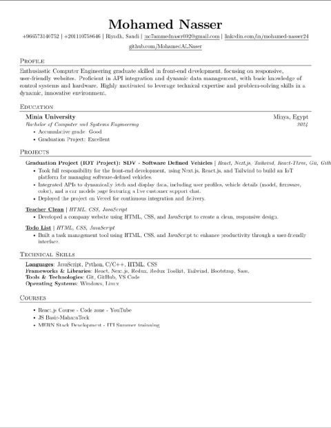 مهندس حاسوب حديث التخرج من Minia University، متخصص في Front - end Development (React, Next. js, Node. js) أسكن في الرياض وابحث عن فرصة في مجال السوفتوير بالمملكة العربية السعودية. أجيد وأتقن ل HTML, CSS, JavaScript, Redux, React. امتلك مهارات حل المشكلات والتعلم السريع. عندي أقامه سارية ورخصة قيادة. اطمح للعمل في بيئة عمل مبتكرة وتساعد علي التطور