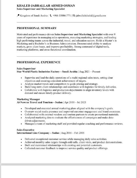 خبرة في مجال التسويق والمبيعات ابحث عن عمل. خربج ادارة أعمال وماجستير تسويق لدي خبرة في دراسة السوق والمنافسين وتحليل نقاط القوة ومعرفة الفئة المستهدفة وتعزيز التواجد على السوشيال ميديا وزيادة المبيعات واتمام الصفقات مع كبار العملاء. إقامة سارية ورخصة اجادة الحاسب الآلي