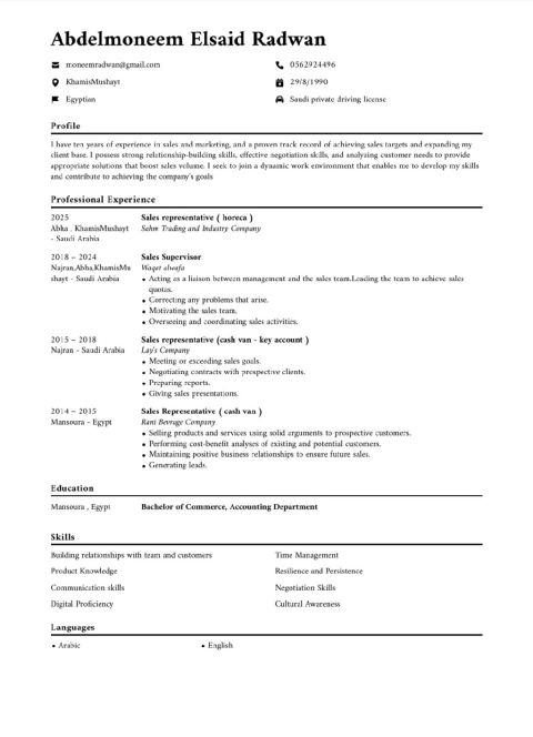 مشرف مبيعات ذو خبرة تزيد عن 10 سنوات في مجال المبيعات، منها 8 سنوات داخل السعودية. امتلك خبرة واسعة في إدارة فرق المبيعات وتحقيق الأهداف البيعية ووضع الخطط والاستراتيجيات التي تضمن نمو الايرادات وزيادة الحصة السوقية. لدي مهارة عالية في بناء العلاقات مع العملاء، وتحليل الأسواق، وتحفيز الفريق لتحقيق أفضل أداء. أسعى دائما لتقديم قيمة مضافة للشركة من خلال تحسين العمليات ورفع كفاءة العمل