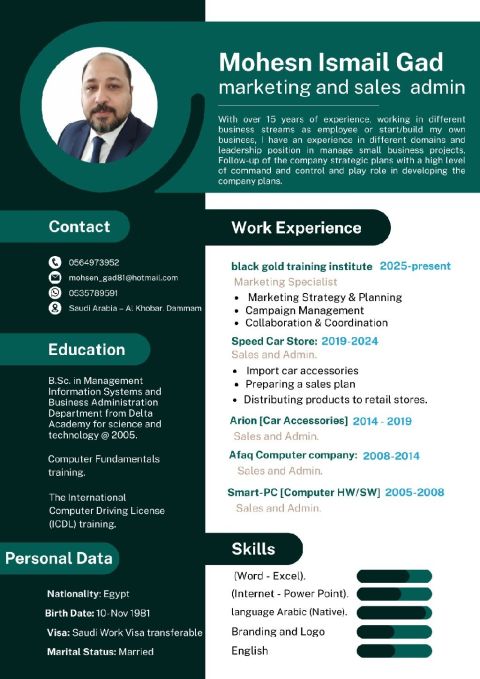 مدير مبيعات وموظف تسويق لديه خبرة طويله في المجالين بخبرة تزيد عن 15 سنة. أملك معرفة واسعه في الشركات والعملاء المحتملين كما أملك أنظمة حديثة تم تطويرها خاصه لجلب بيانات العملاء المحتملين مثل غوغل داتا سكر ابر - تحليل بيانات العملاء والبيانات وأرشفتها. كما أملك خبرة واسعه وعلاقات مجتمعيه واسعه
