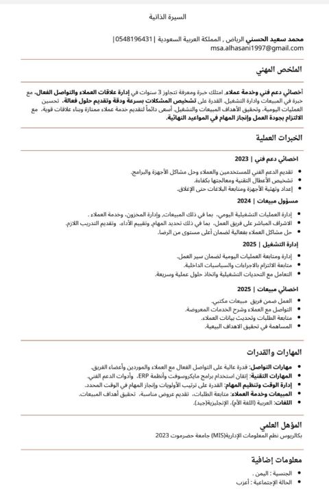 أخصائي دعم فني وخدمة عملاء بخبرة 4 سنوات في الدعم التقني، المبيعات، والتشغيل متميز في التواصل الفعال حل المشكلات، وتنظيم العمل، وأسعى لفرصة مهنية أساهم من خلالها في تحقيق أهداف المنشأة وتطوير أدائي الوظيفي