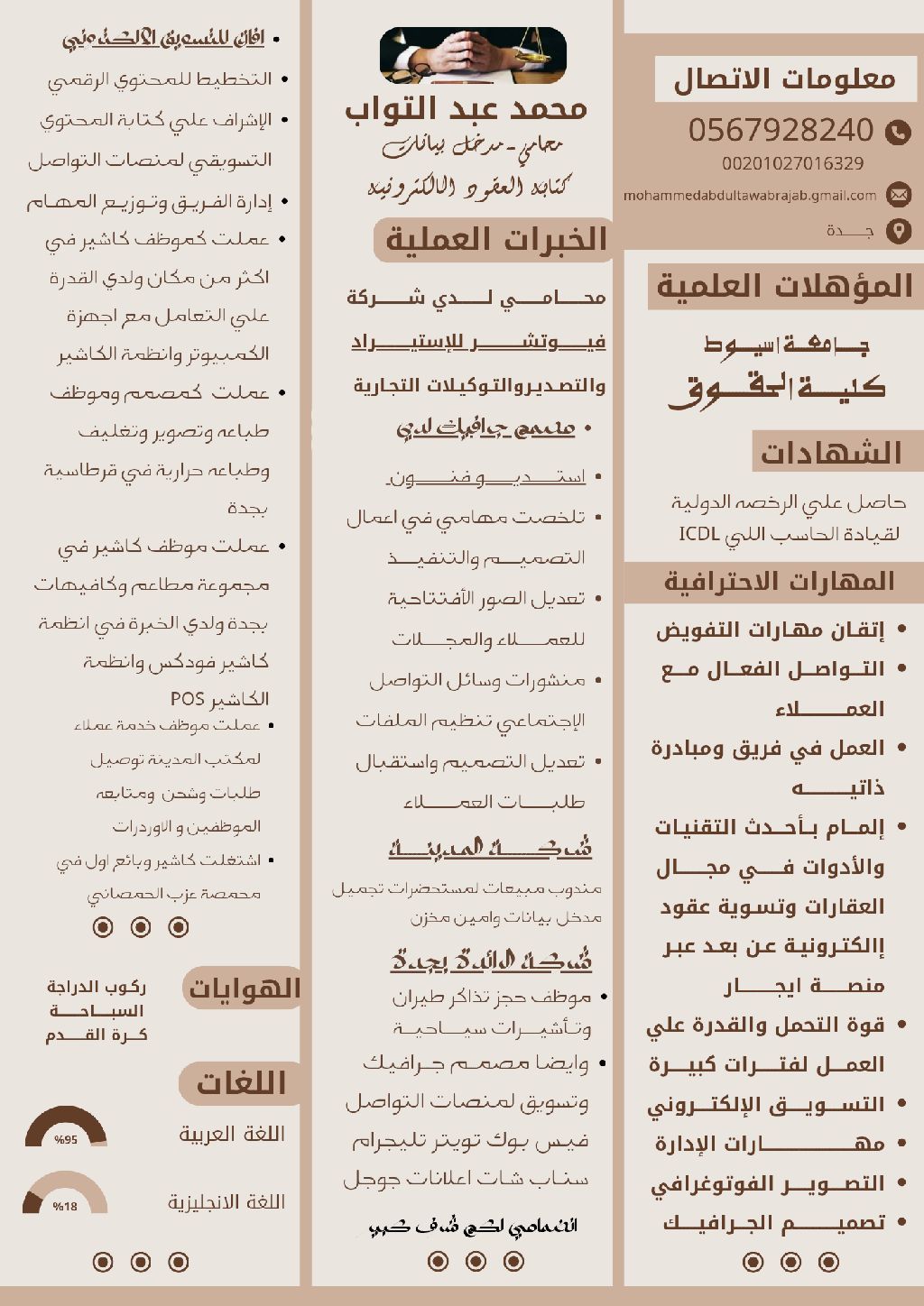 محامي يبحث عن فرصة عمل خبرة في جميع مواقع التواصل من تصميمات واعلانات مموله خبرة في كتابة العقود الالكترونية من منصة إيجار اشتغلت كاشير في قرطاسية في جدة وموظف حجز تذاكر طيران وإدارة كاملة للمكتب من تسويق ومبيعات وتصوير منتجات اشتغلت مدخل بيانات وأجيد براج الأوفيس ومندوب مبيعات وأمين مخزن وموظف خدمة عملاء لمكتب شحن وتوصيل متابعه الموظفين والأوردرات عملت في مكتب صيانة المصاعد متابعة للصيانة والعملاء