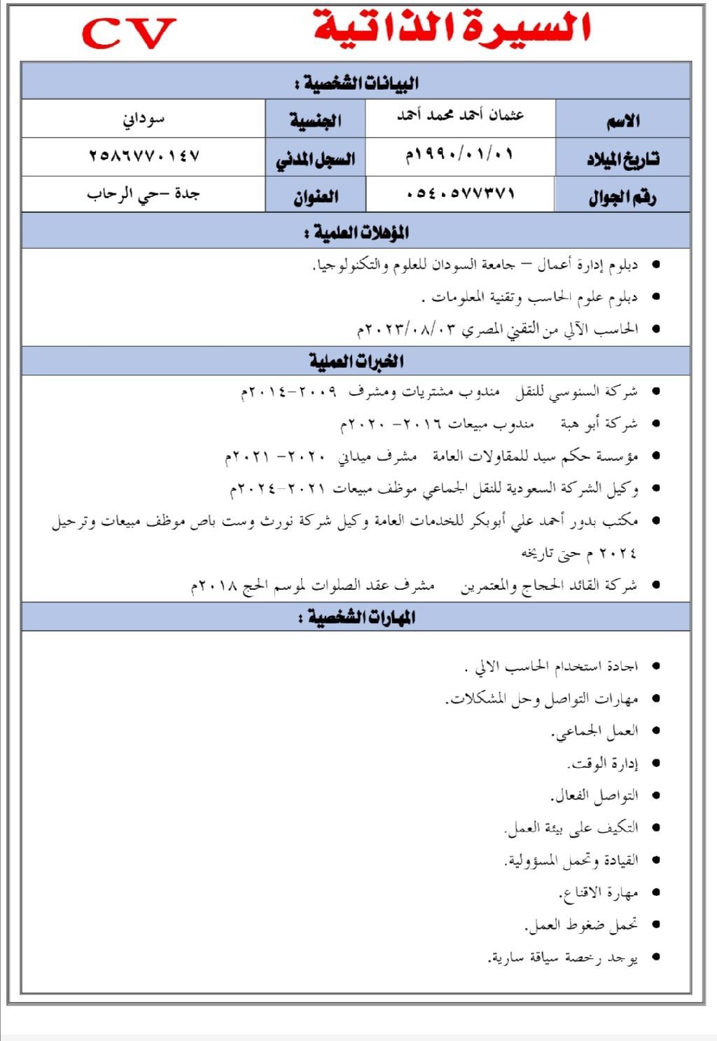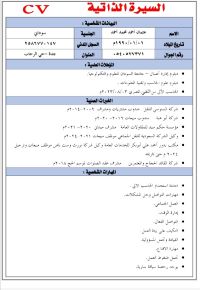 أنا شاب سوداني ابحث عن عمل وأحمل رخصة قيادة سارية وإقامة سارية ولدي الخبرة لدي مندوب مبيعات أو مندوب مشتريات ولدي الخبرة في الحاسب الآلي واشراف على محلات أو عمال أو مندوب ميداني ولدي خبرة أمين مستودع ولدي خبرة في مجال الشقق الفندقية المخدومة ولدي خبرة في مجال قطع غيار السيارات مشرف مستودع أو مبيعات خبرة الترحيل والنقل وإدارة التشقيل وأتحمل ضغط العمل والتعاون مع فريق العمل وشعاري الصدق والامانة