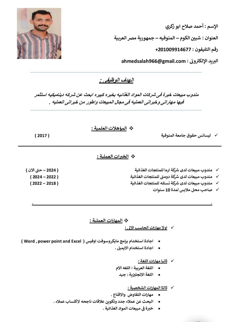 مندوب مبيعات خبرة 8 سنوات حاصل علي شهادة المندوب المتميز من شركة نستله أيضا لدي خبر في بيع الملابس الجاهزه الشبابي عملت كنت امتلك متجر قبل العمل في شركة نستله ابحث عن فرصة عمل لاكتساب خبرات جديدة امتلك خبرة ع الاقناع وترويج المنتجات واكتساب ثقة العميل