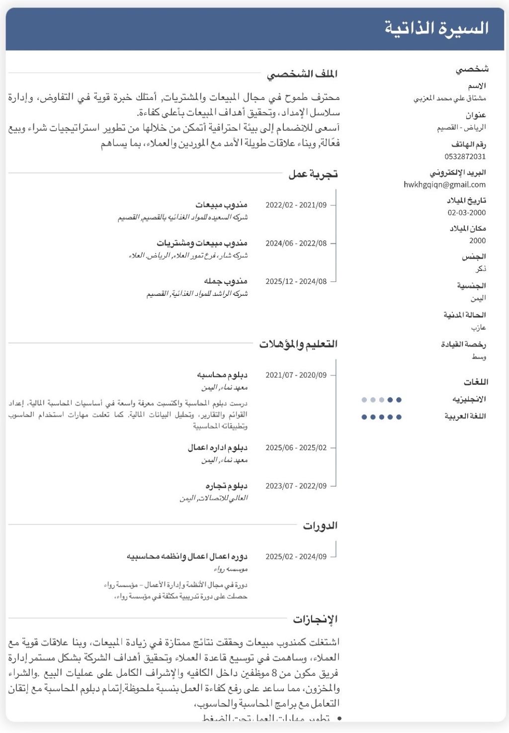 محترف طموح في مجال المبيعات والمشتريات، امتلك خبرة قوية في التفاوض، وإدارة سلاسل الإمداد، وتحقيق أهداف المبيعات بأعلى كفاءة. أسعى للانضمام الى بيئة احترافية أتمكن من خلالها من تطوير استراتيجيات شراء وبيع فعالة، وبناء علاقات طويلة الأمد مع الموردين والعملاء