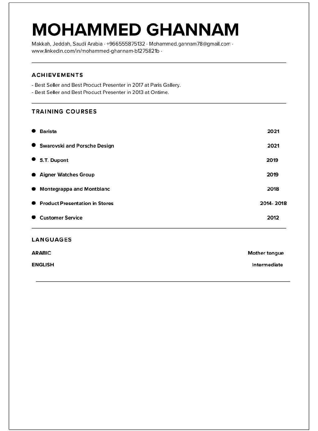 خبرة تزيد عن 15 سنة في مجال المبيعات والتسويق، حيث عملت لمدة 15 سنة في بعض من أفضل الشركات العالمية والأقسام (المبيعات - المخزون) وضمان تحقيق الأهداف والمعايير المطلوبة