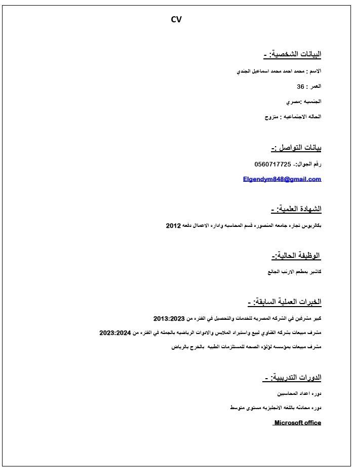 ابحث عن فرصة عمل كاشير أو مسؤول مبيعات أو مدخل بيانات اعمل حاليا كاشير بمطعم الأرنب الجائع وعملت سابقا مبيعات بمحل مستلزمات طبية ومحل أدوات ومستلزمات وملابس رياضيه لدي اقامة وشهادة صحيه سارية