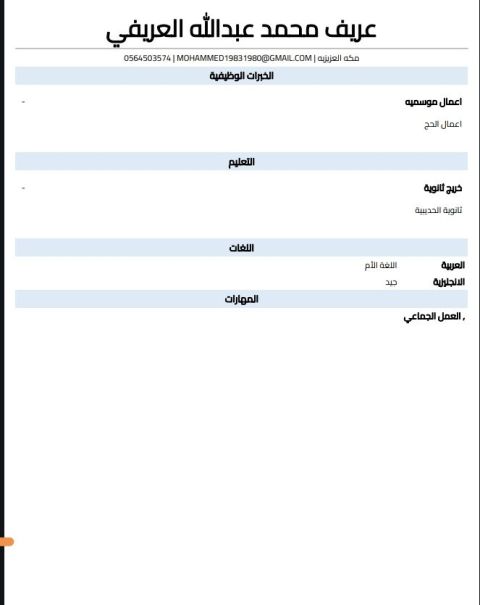 أنا عريف، شاب مهتم بالعمل في المبيعات أو التسويق، وابحث عن وظيفة بدوام كامل في مكة - حي العزيزية. الخبرة مبتدئ ولدي رغبة قوية في التعلم والتطوير. المهارات مهارة جيدة في ترتيب وتنظيم العمل معرفة بسيطة في المحاسبة (وأحتاج لتطويرها بتدريب بسيط) جاد في العمل، ملتزم، وقابل للتعلم بسرعة المهنة المطلوبة أي وظيفة مناسبة في مجال المبيعات - التسويق - خدمة العملاء أو الأعمال التي