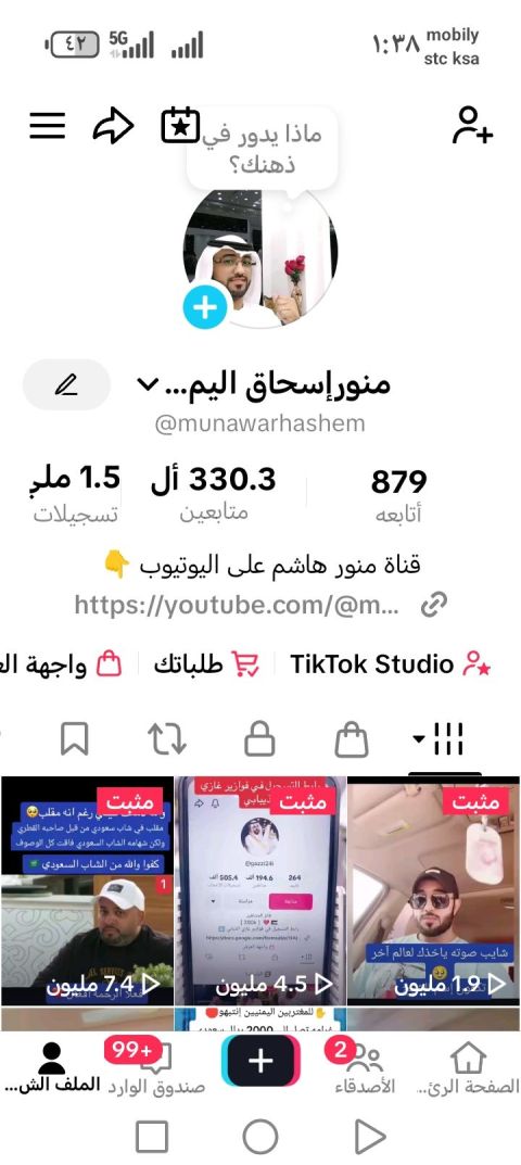 أنا منور إسحاق مسوق اعلاني لدي متابعين في منصة التيك توك 330 ألف متابع أعلى مقطع وصل 7 ملايين مشاهدة باقي المقاطع توصل عشرات الألاف ومئات الألاف. أرغب في وظيفة أما تسويق الكتروني أو مندوب مبيعات. اشراف. إدارة كلها اشتغلها عندي فيها خبرة أكثر من 15 سنة. متواجد في نجران حاليا. طبعا يمني الجنسية. وابشروا بالقوي الأمين إن شاء الله