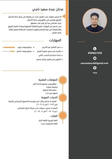 شاب جاد وطموح ابحث عن فرصة عمل كمندوب مبيعات / مشتريات. امتلك سيارة خاصة وجاهز للعمل فورا. لدي القدرة على التواصل الجيد مع العملاء الالتزام بالمواعيد تحمل ضغط العمل انجاز المهام الموكلة بكفاءة أفضل العمل في بيئة احترافية تقدر الجدية والاجتهاد