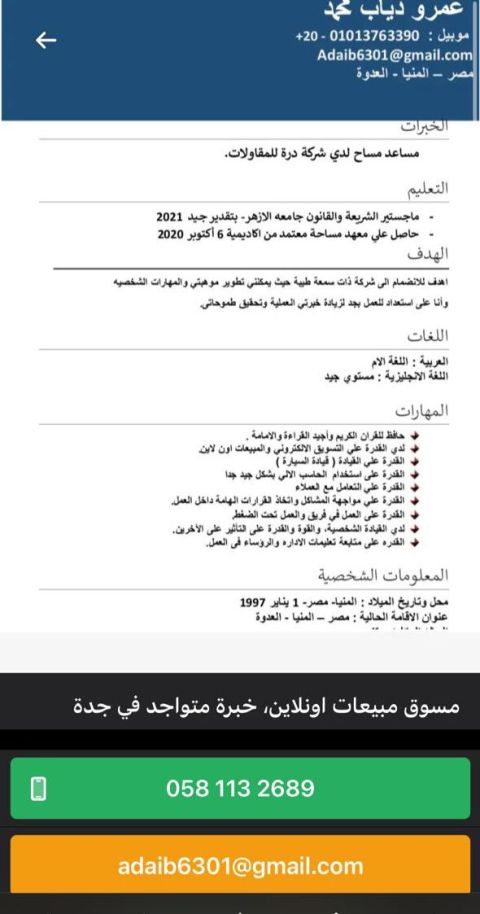 الاسم عمرو دياب محمد الجنسية مصري / الخبرة في مجال التسويق والمبيعات اونلاين أكثر من ثلاث سنوات والعمل في الادارة العمل في أدق الظروف وتحمل الضغط على العمل