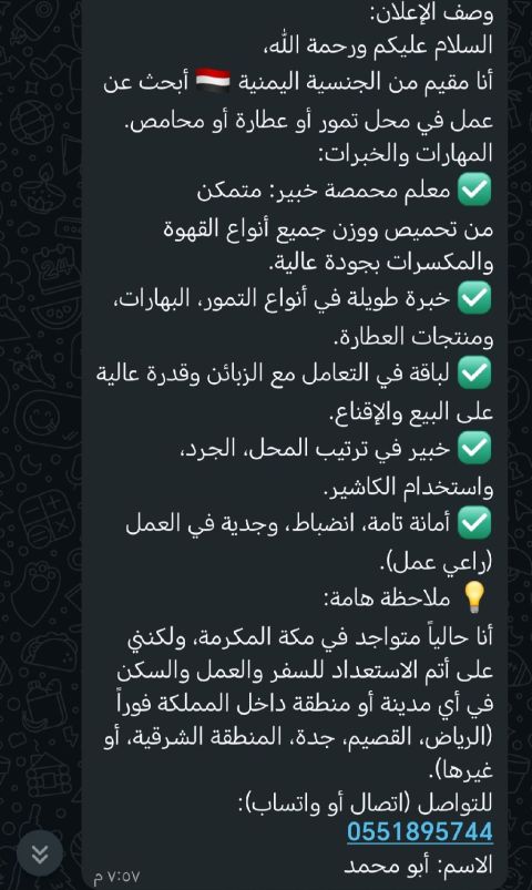 بائع خبير ومعلم محمصة (يمني) مستعد للعمل فورا خبير بأنواع التمور، العطارة، البهارات، وتحميص القهوة والمكسرات بجودة عالية. لبق في التعامل، خبير بالكاشير والجرد، وأمين (راعي عمل) الموقع الحالي مكة المكرمة. ملاحظة مستعد تماما للسفر والسكن والعمل في أي منطقة بالمملكة (الرياض، القصيم، جدة. الخ) للتواصل الاسم أبو محمد