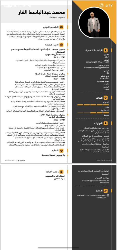 خبرة عشر سنوات بسوق العمل السعودي بمجال المبيعات والعمل كمندوب ومبيعات ومشرف المبيعات ولدي القدرة علي العمل باي مجال بالمبيعات