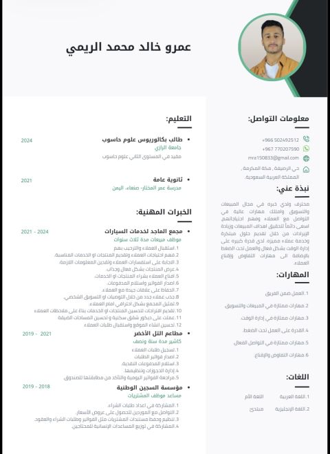 شاب طموح امتلك خبرة عملية أكثر من 5 سنوات في مجال المبيعات وخدمة العملاء، عملت في معارض سيارات، مطاعم، ومجال المشتريات. أتميز بمهارات عالية في التواصل مع العملاء، الاقناع، التفاوض، وتحقيق أهداف المبيعات، مع القدرة على العمل تحت الضغط وإدارة الوقت بكفاءة. ولدي قابلية سريعة للتعلم والتطور، وابحث عن فرصة عمل مستقرة أضيف فيها قيمة حقيقية للفريق وأطور من مهاراتي المهنية