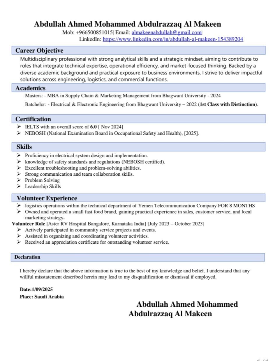 Looking for a job opportunity in one of the following fields Electrical & Electronics Engineering, Supply Chain Management, or Sales, Marketing, and Advertising. A multidisciplinary professional with strong analytical skills and a strategic mindset, backed by a diverse academic background and hands - on experience in business environments. I aim to deliver impactful solutions