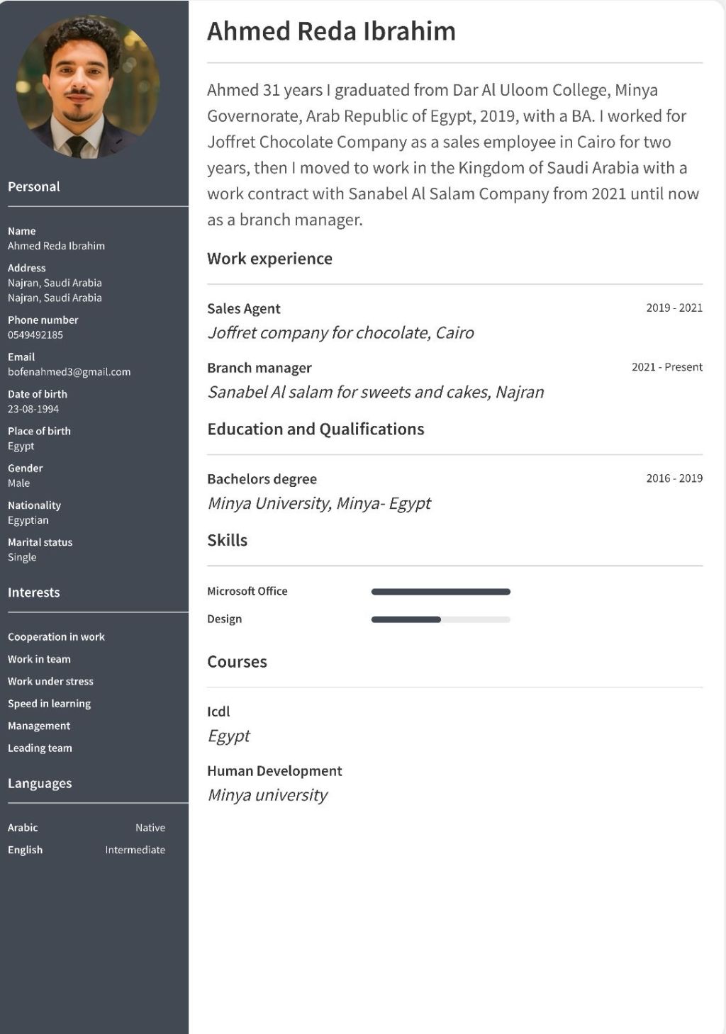 أحمد رضا إبراهيم مصري الجنسية مدير لفرع لدي شركة سنابل السلام لمدة 4 سنوات خبرة في مجال المبيعات والتسويق والادارة خريج ليسانس لغة عربية ودراسات اسلاميه