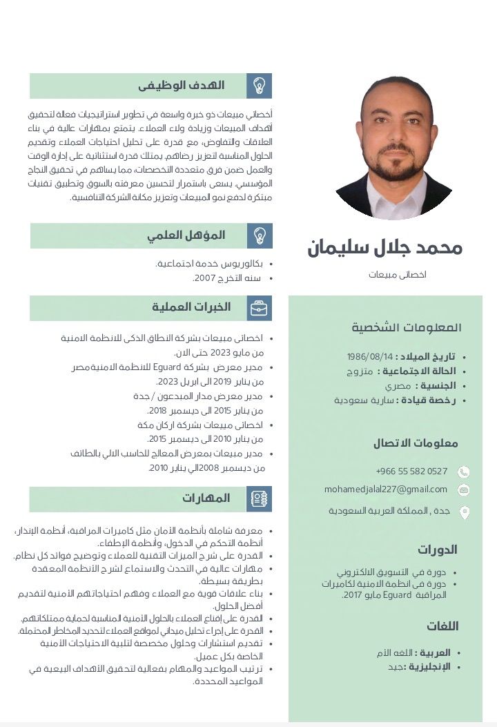 مشرف مبيعات مصري الجنسية 38 عام عمري خبرة بالمملكة من 2008 عملت بأكثر من مجال بداية من مبيعات الكمبيوتر وأكسسواراتوا ومبيعات الأنظمة الأمنية عملت بأكثر من مدينة كجدة والرياض والدمام مستعد التنقل لأي مكان. مقدرة علي قيادة فريق عمل، فتح أسواق جديدة، تحقيق أهداف الشركة البيعية، الشغل والحماس والوصول لأفضل النتائج. أتطلع لتجربة جديدة بتحديات أكبر