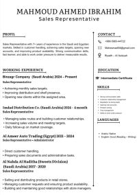 Sales Representative with 7 + years of experience in the Saudi and Egyptian markets. Skilled in customer handling, achieving sales targets, opening new accounts, and improving product availability. Strong communication skills, fast learner, and able to work under pressure to deliver measurable results