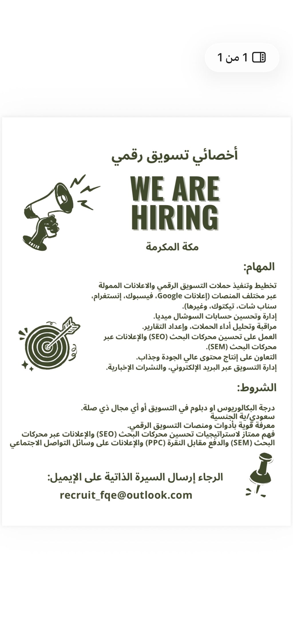 شركة مواد غذائية تبحث عن موظف سعودي أو سعودية الجنسية لوظيفة أخصائي تسويق رقمي في مكة المكرمة حي الزايدي لمن تتوفر لديهم الشروط الرجاء إرسال السيرة الذاتية في الايميل الظاهر في الصورة (الرجاء النظر في المرفق للمهام والشروط)