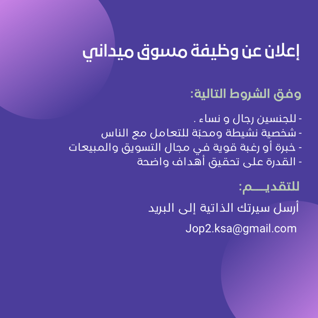 هل تمتلك مهارات الاقناع وحب التحدي هل تبحث عن دخل متزايد حسب مجهودك انضم لفريقنا كمندوب تسويق ميداني بنظام النسبة. المميزات دخل بدون سقف عمولات مجزية على كل عملية بيع أو تعاقد - العمل ميداني في منطقة مكة وجدة والطائف وما حولها. مقر الشركة مكة المكرمة - الشوقية - شارع محمد الجبير