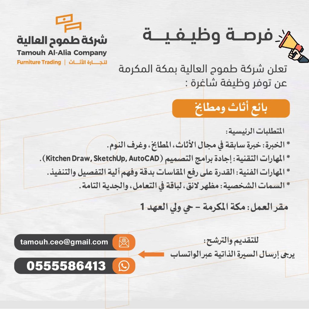 فرصة وظيفية بائع أثاث ومطابخ شركة طموح العالية لتجارة الأثاث - مكة المكرمة المتطلبات الرئيسية الخبرة خبرة سابقة في مجال الأثاث، المطابخ، وغرف النوم. المهارات التقنية اجادة برامج التصميم (Kitchen Draw, SketchUp, AutoCAD) المهارات الفنية القدرة على رفع المقاسات بدقة وفهم آلية التفصيل والتنفيذ. السمات الشخصية مظهر لائق، لباقة في التعامل، والجدية التامة. مقر العمل مكة المكرمة - حي ولي