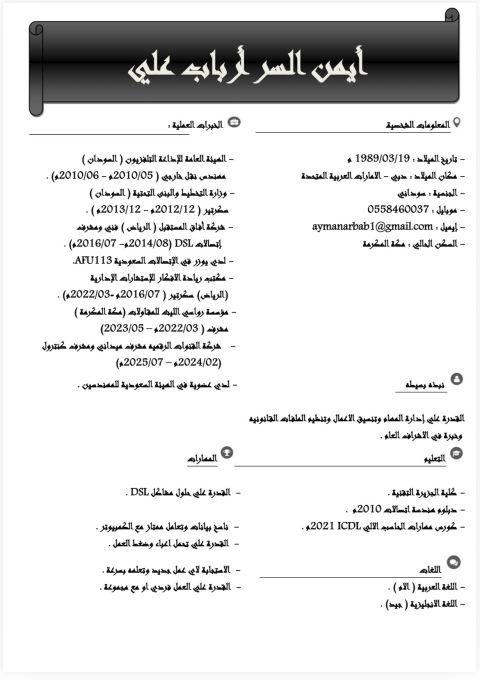 أنا سكرتير خبرة في مجال السكرتارية ابحث عن فرصة عمل مناسبة، اجادة استخدام برامج Microsoft Office خاصة (Woord, Excel) وأيضا أجيد التعامل مع العملاء وتنظيم الملفات والمواعيد بدقة واحترافية، التنسيق بين الأقسام الادارية، أتمتع بعدة مهارات مثل تنظيم ممتاز للمواعيد والمهام، اللباقة وحسن التعامل، سرعة في الطباعة وإدارة المراسلات، وأتمتع بالسرية في العمل، جاهز للعمل فورا بدوام كامل أو جزئي حسب المتاح
