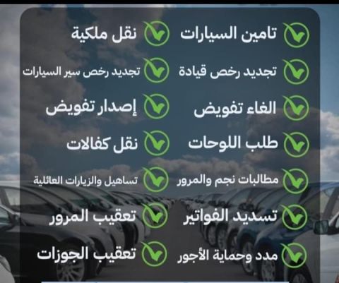 يوجد لدينا جميع خد آت السيارات نقل فوري. تأمين. تجديد استمارة. تجديد رخصة. أد استبدال لوحات. اسقاط. وجميع خدمات تعقيب المرور