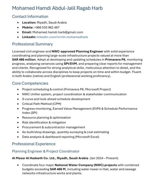 Planning, Follow - up & Project Coordination Engineer with practical experience working within the Project Management Office (PMO) of a major contracting company. Responsible for developing and updating project schedules, tracking progress, issuing periodic reports, and coordinating project requirements to ensure alignment with approved plans. Certified by the National Water Company (NWC) as a Planning