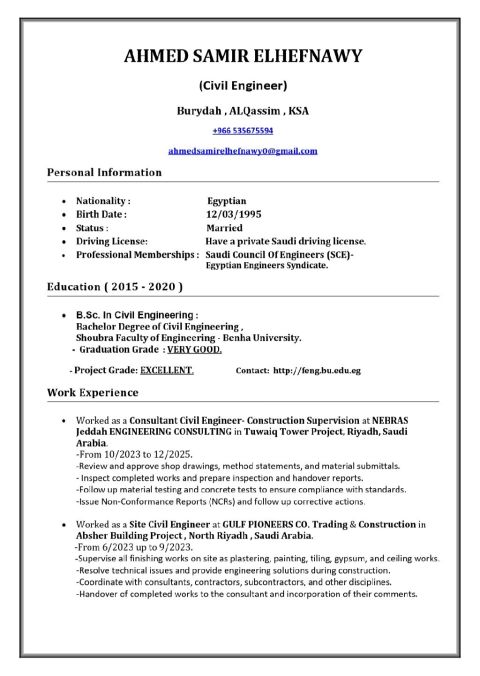 Civil engineer with 6 years of experience, including 3 years in KSA (concrete works, finishing, and engineering offices supervising construction) registered with the Saudi Council of Engineers, holding a valid Saudi driver's license and a valid, transferable Iqama, Currently residing in ALQassim and willing to work anywhere in KSA in a suitable work environment