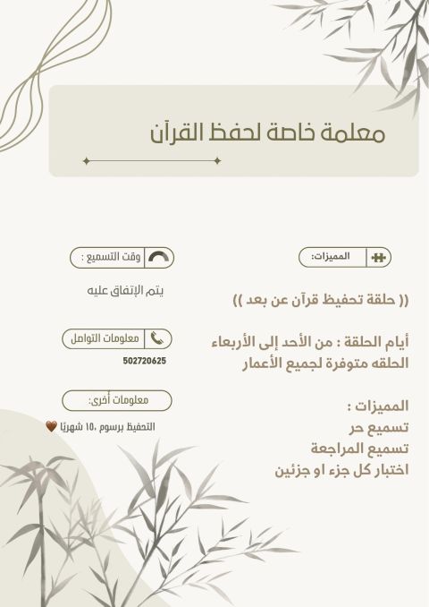 معلمه خاصه لحفظ القران عن بعد عبر التلجرام أو ألزوم، الوقت يتم الاتفاق عليه، برسوم يسيرة