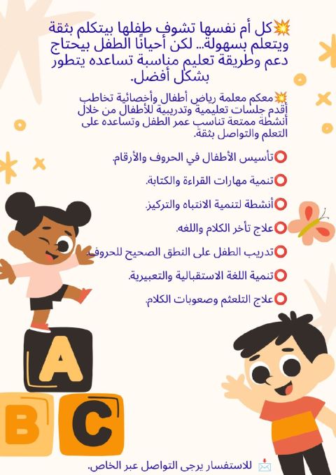 معلمة رياض اطفال وأخصائية تخاطب أتأسيس الاطفال في الحروف والأرقام وتنمية مهارات في الحروف والكتابة وأنشطة لتنمية الانتباه والتركيز وعلاج تأخر الكلام واللغة وتدريب الطفل علي النطق الصحيح للحروف وتنمية اللغة الاستقبالية والتعبيرية وعلاج التعلثم وصعوبات الكلام