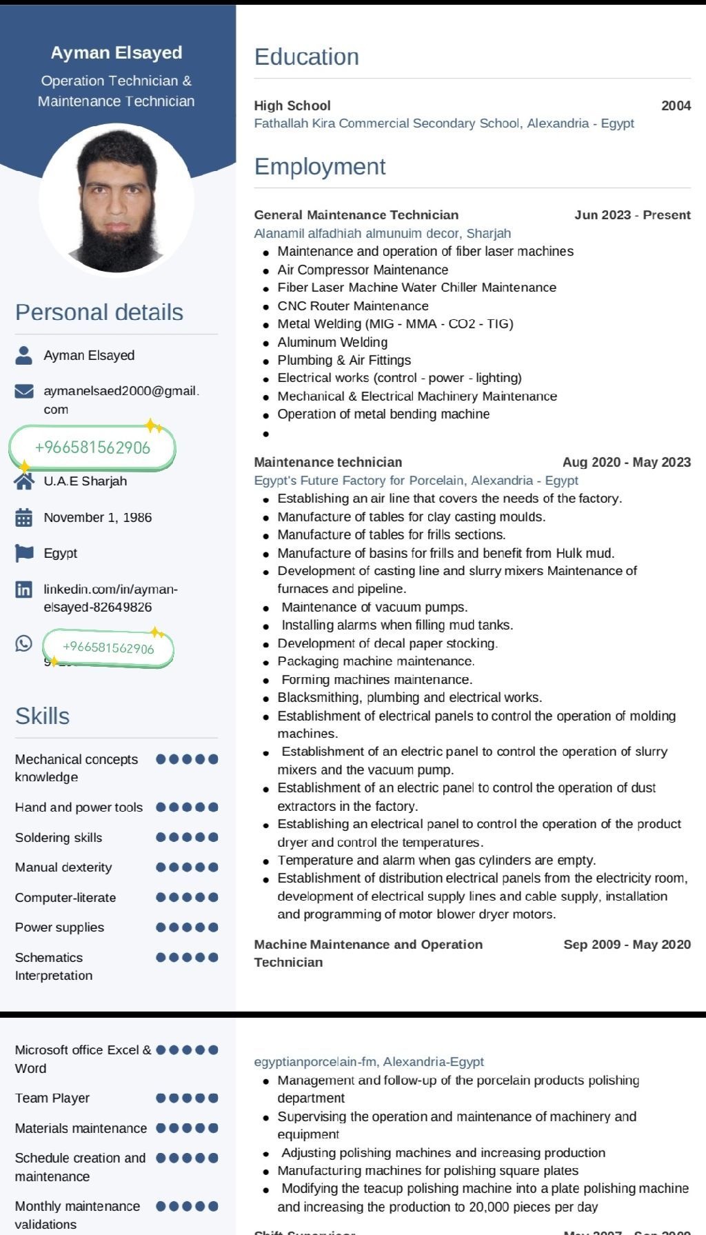 فني تشغيل وصيانة ماكينات CNC وفايبر لايزر، فني صيانة عامة، لحام ميج ألومينيوم وستيل، أعمال الحدادة، استخدام برامج cypcut & AutoCAD & Mach 3