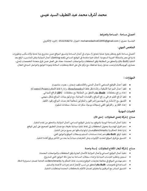 مساح خبرة 5 سنوات في كبرى المشاريع داخل المملكة مثل القدية والفرسان والمكعب وحديقة الملك عبد الله ومطار الملك خالد عملت في مجالات الطرق، اللاند سكيب، الإنشاءات، ومشاريع البنية التحتية ابحث حاليا عن فرصة عمل داخل المملكة إقامة سارية ومتاح نقل الكفالة امتلك رخصة قيادة مقيم في الرياض