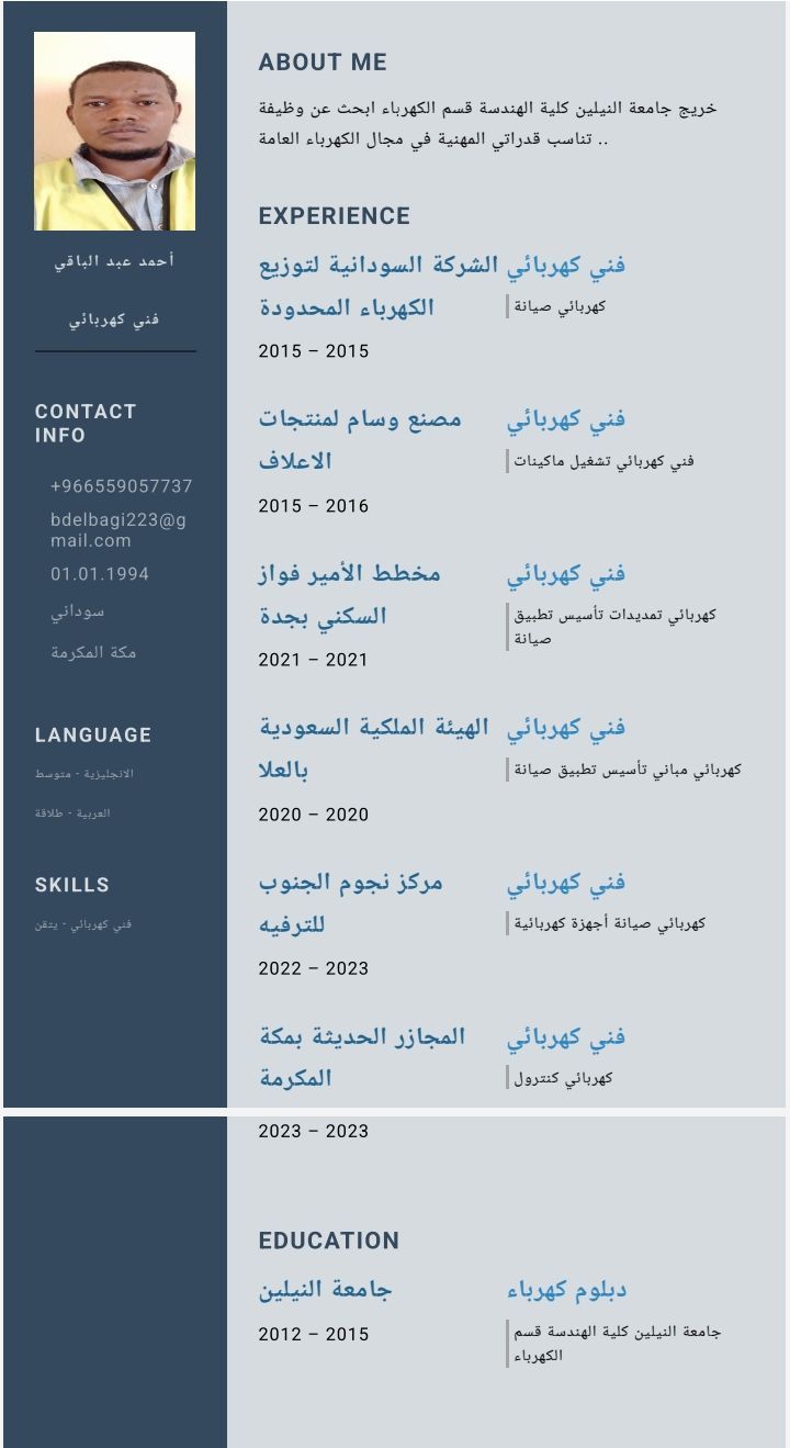 فني كهربائي الجنسية سوداني تأسيس تطبيق صيانة تمديدات أسقف وكهرباء مصانع كنترول