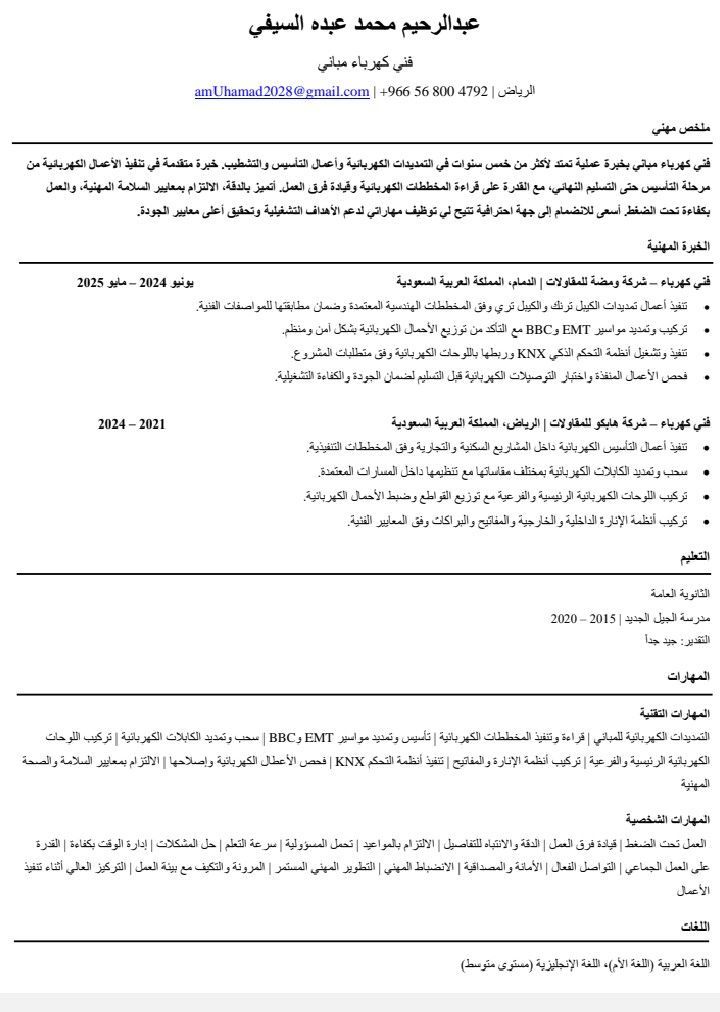 أنا فني كهرباء تأسيس مواسير EMT والتريهات BVC تشطيب لوحات ترمنيشن اللوحات أو تركيب كايبل تري وكايبل ترنك الجنسية يمني العمر 26 الإقامة ساري المفعول