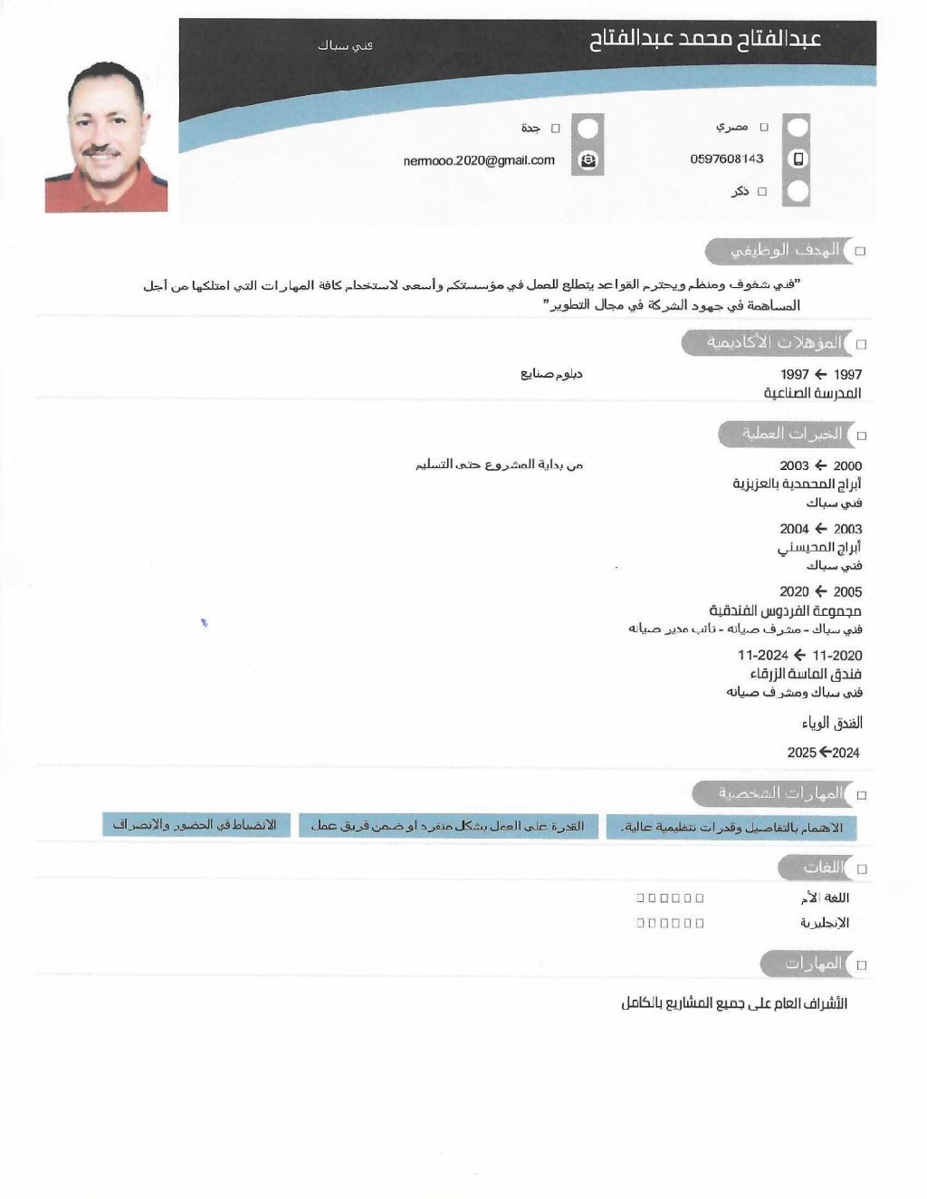 سباك تأسيس تشطيب خبرة في صيانة بالفنادق خبرة بجميع الصيانات بالمبنى من كهرباء نجار ملم بجميع الصيانات