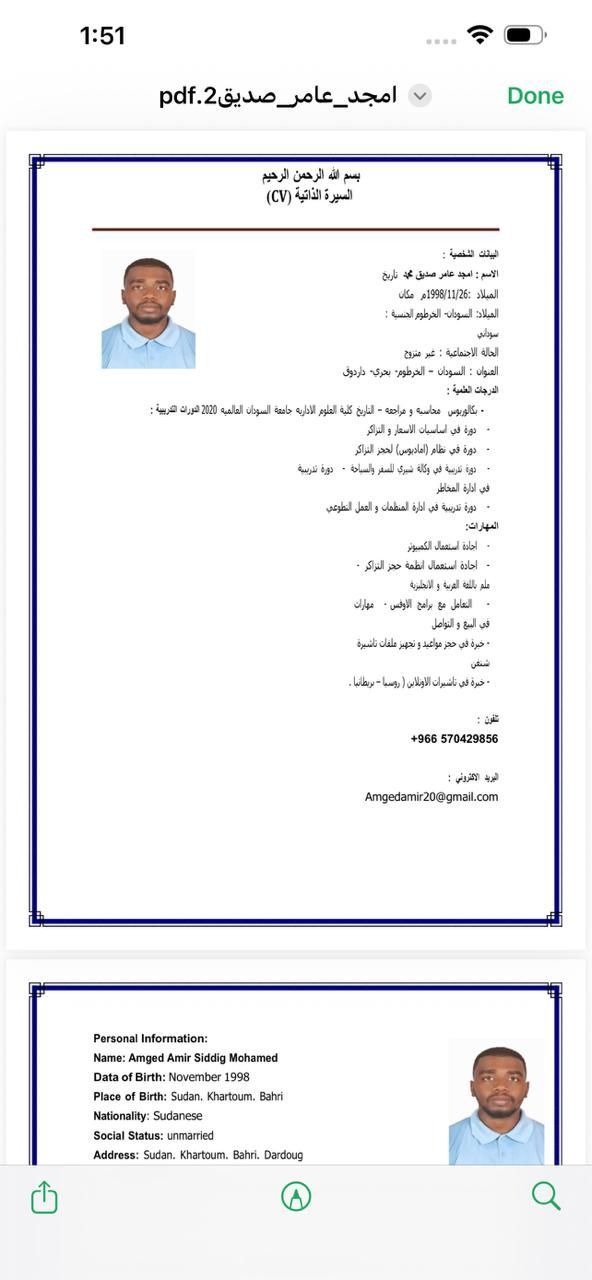 باحث عن عمل. موظف حجوزات تذاكر طيران خبرة 5 سنوات وخبرة سنة داخل المملكة العربية السعودية في أنظمة الطيران المختلفة مع شهادة اماديوس وأنظمة حجز الطيران الاقتصادي وخبرة بتجهيز الملفات وبحجز مواعيد تأشيرات شنغن وروسيا وبريطانيا