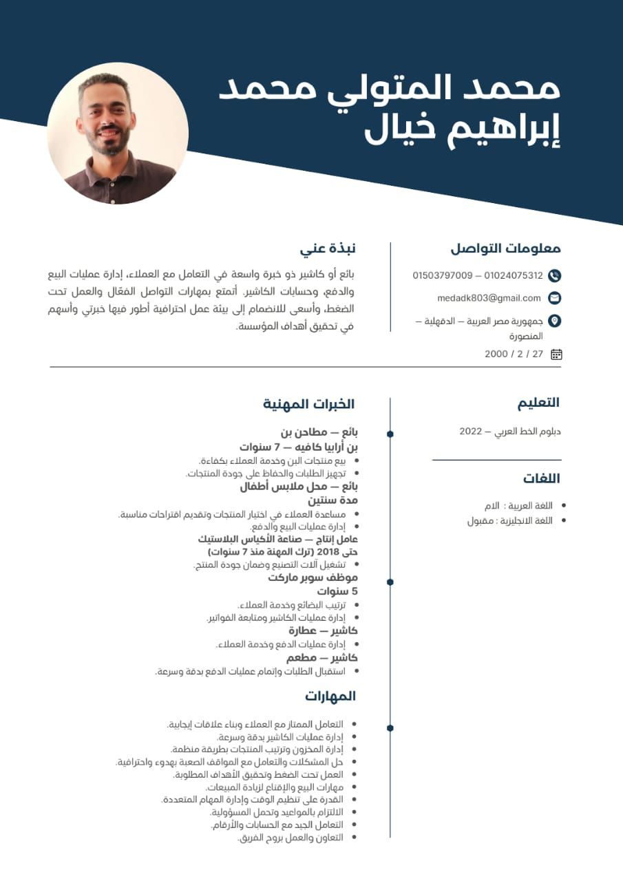 الاسم محمد خيال اعمل لدي مطاحن بن من 7 أعوام أجيد العمل لدي الماركت خبرة خمس أعوام أجيد التعلم السريع خفيف الحركة أجيد في العمل وسرعة الاندماج وخبرة 5 سنوات كاشير
