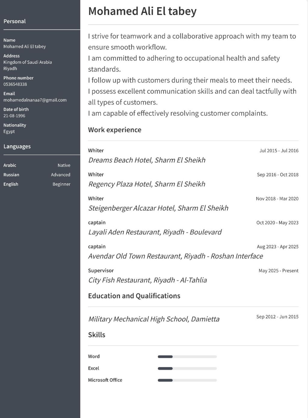ابحث عن عمل. خبرة 10 سنوات في مجال الأغذية والمشروبات. سياحة وفنادق