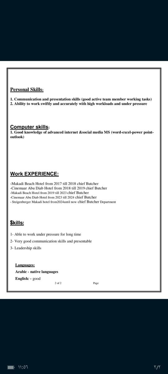شيف جزار خبرة 10 سنين في الفنادق عمري 32 سنة و4 سنين شغل في السعودية في مجال الفنادق