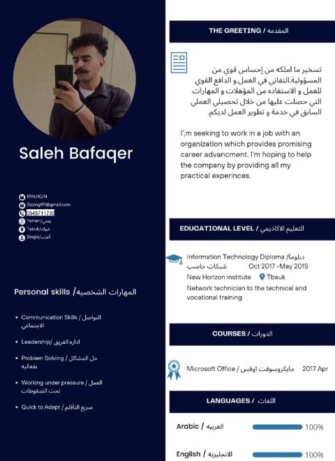 Tabuk/ years experience in cafés. Excellent English. Skilled in floor management, barista, cashier, customer service, and maintaining product quality. Familiar with municipality requirements, stock control, and supplier coordination. Can work under pressure. Yemeni, born in KSA, valid Iqama & health certificate, CV and experience certificate available