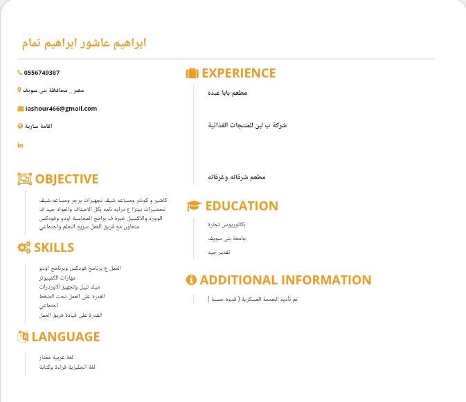 هيد كاشير وديسباتشر على دراية تامة بكل أصناف الطعام والمشروبات بالمطعم ومساعد شيف جريل متعاون مع جميع فريق العمل التجهيزات والتشغيل والتسليم