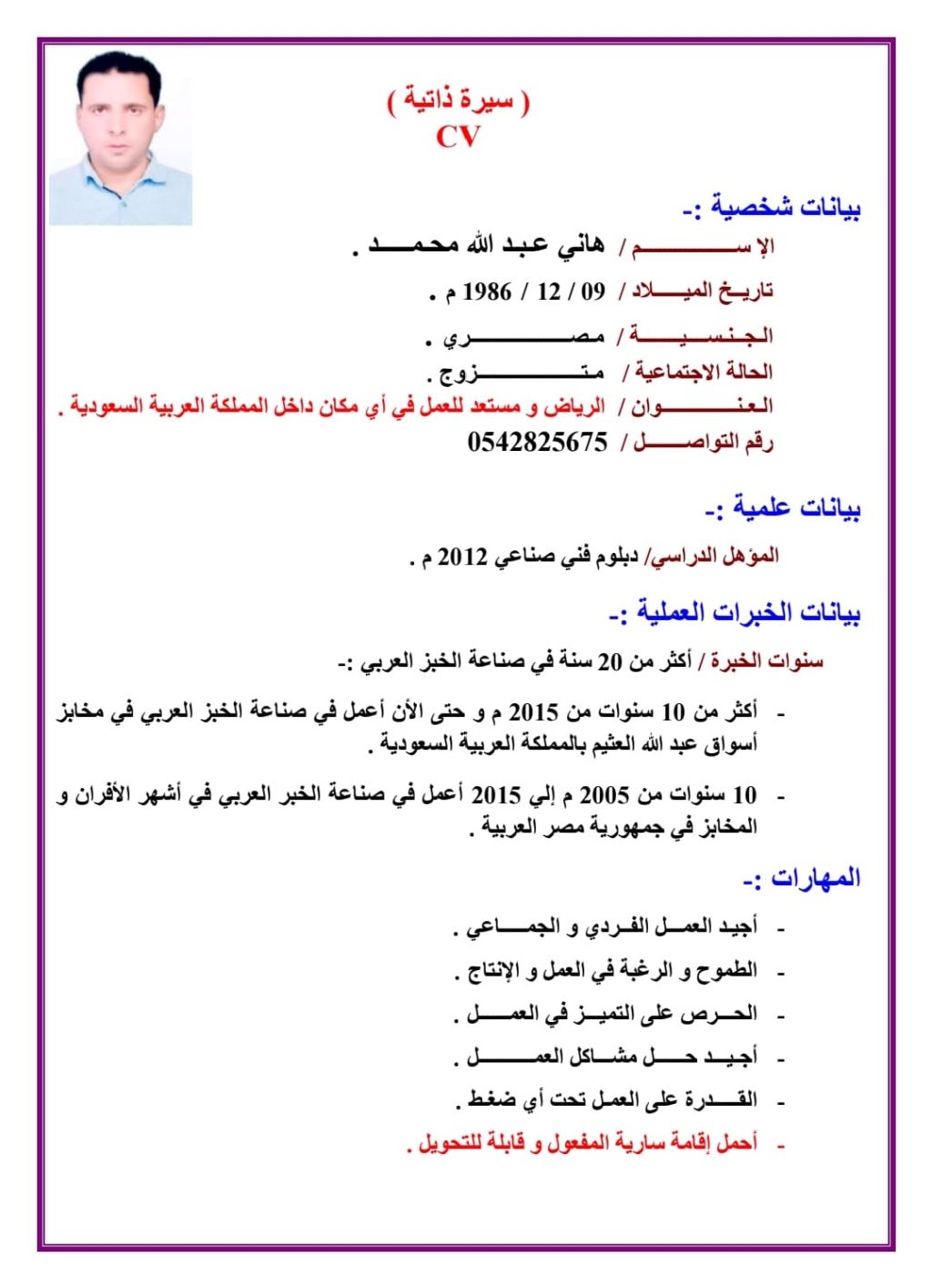 شيف خبز عربي ولبناني / خبرة تفوق أل 20 عام في صناعة الخبز العربي واللبناني / العمل لدى أسواق عبدالله العثيم أكثر من 10 سنوات