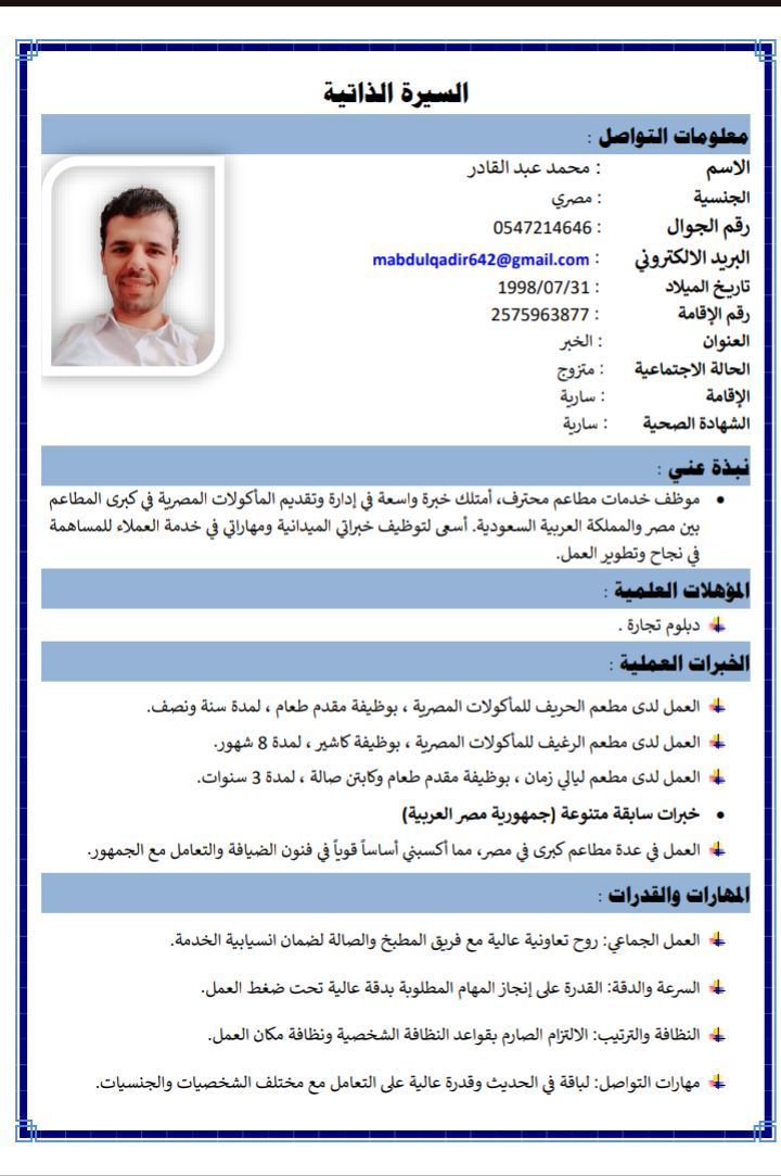 موظف خدمات مطاعم محترف، امتلك خبرة واسعة في إدارة وتقديم المأكولات المصرية في كبرى المطاعم بين مصر والمملكة العربية السعودية. أسعى لتوظيف خبراتي الميدانية ومهاراتي في خدمة العملاء للمساهمة في نجاح وتطوير العمل