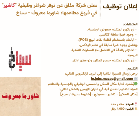 اعلان توظيف "كاشير" مكة - جدة تعلن شركة مذاق عن توفر شواغر وظيفية "كاشير" في فروع مطاعمها الشوقية - العوالي، جدة الروضة - السامر شاورما معروف - سياخ المتطلبات أن يكون المتقدم سعودي الجنسية. وجود خبرة سابقة ككاشير. الالمام باستخدام أنظمة نقاط البيع (POS) ويفضل وجود خبرة سابقة في نظام فودكس. الالتزام والدقة في التعامل مع العمليات النقدية اليومية. أن يكون المتقدم حسن المظهر وذو مظهر لائق. التقديم يرجى