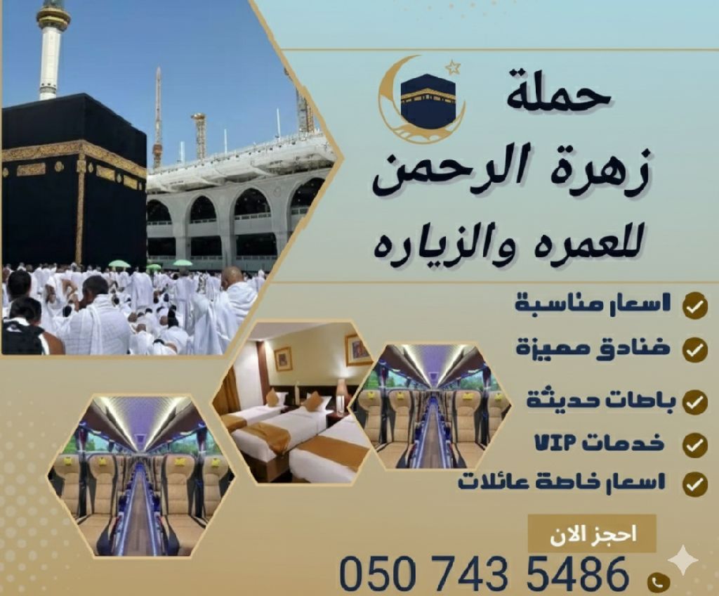حملة زهرة الرحمن للعمره والزيارة الى مكة حيث تسكن القلوب رحلة عمرة تعيد للروح طمأنينتها، وتقربك من نفحات الرحمة نسا فر معكم لنعيش الايمان من جديد رحلات عمرة وزيارة بخدمات متكاملة فنادق قريبة - مواصلات مريحة - اشراف مستمر. نقدم لكم رحلة آمنة وتجربة لا تنسى. معنا رحلتك للعمرة أسهل وأجمل في كل عام نرافقكم الى أطهر بقاع الأرض نوفر لكم برامج عمرة وزيارة بأعلى معايير الراحة