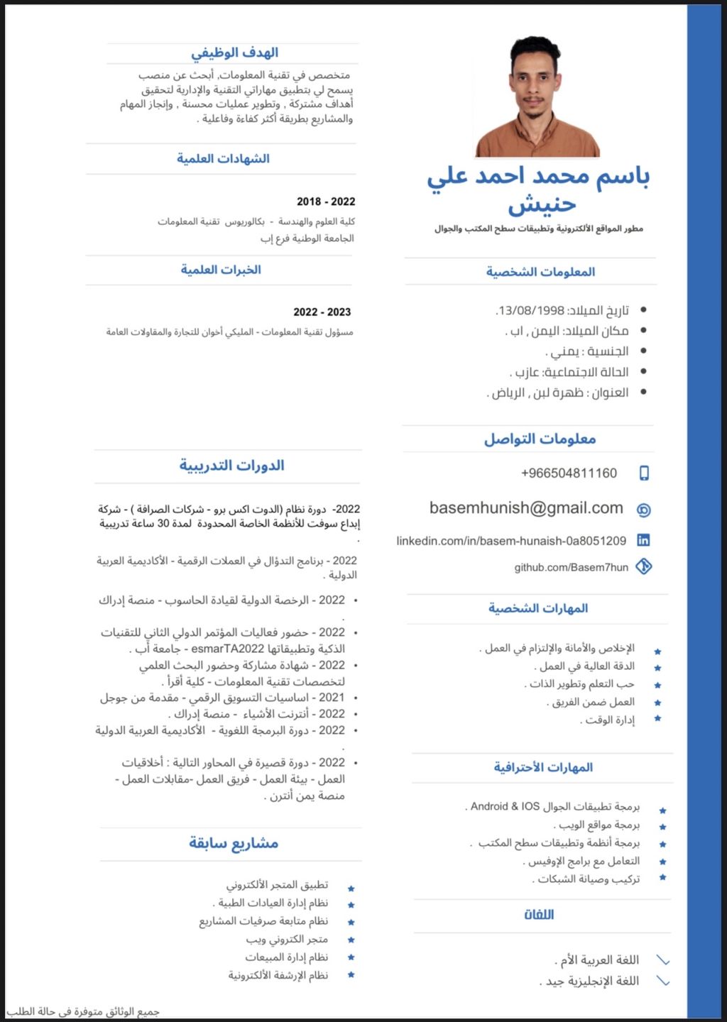 ابحث عن فرصة عمل في مجال الدعم الفني - Help Desk. لدي معرفة جيدة في التعامل مع أنظمة التشغيل (ويندوز، ماك) والدعم عن بعد، وحل مشاكل المستخدمين، بالاضافة الى أساسيات الشبكات والبرمجيات المكتبية. أسعى للانضمام الى فريق عمل احترافي أتمكن فيه من تطوير مهاراتي وتقديم أفضل ما لدي في مجال خدمة ودعم المستخدمين عندي بكالوريوس تقنية المعلومات
