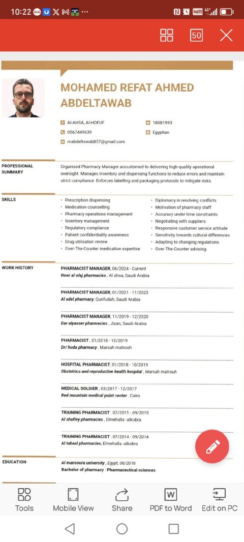 صيدلي، 28 سنة، مرخص من قبل الهيئة السعودية للتخصصات الصحية، امتلك خبرة عملية في صيدليات المجتمع والبحث والتطوير الدوائي، مع مهارات مميزة في تقديم الاستشارات العلاجية، وتحسين تجربة المرضى، وزيادة المبيعات من خلال التوصيات الدقيقة وبناء علاقات ثقة مع العملاء. متمكن في إدارة مهام الصيدلية والعمل تحت الضغط، وأسعى حاليا للحصول على فرصة عمل أقدم من خلالها قيمة مضافة وأسهم في تطوير أداء الصيدلية